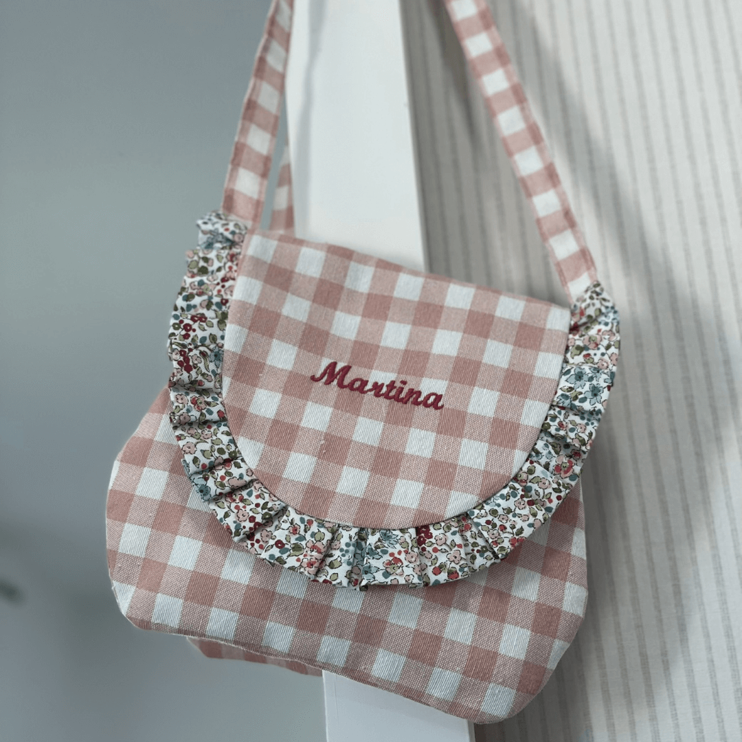 Este bolso lo realizamos para regalo de comunión, también elegimos el diseño, los tejidos y lo bordamos con su nombre.