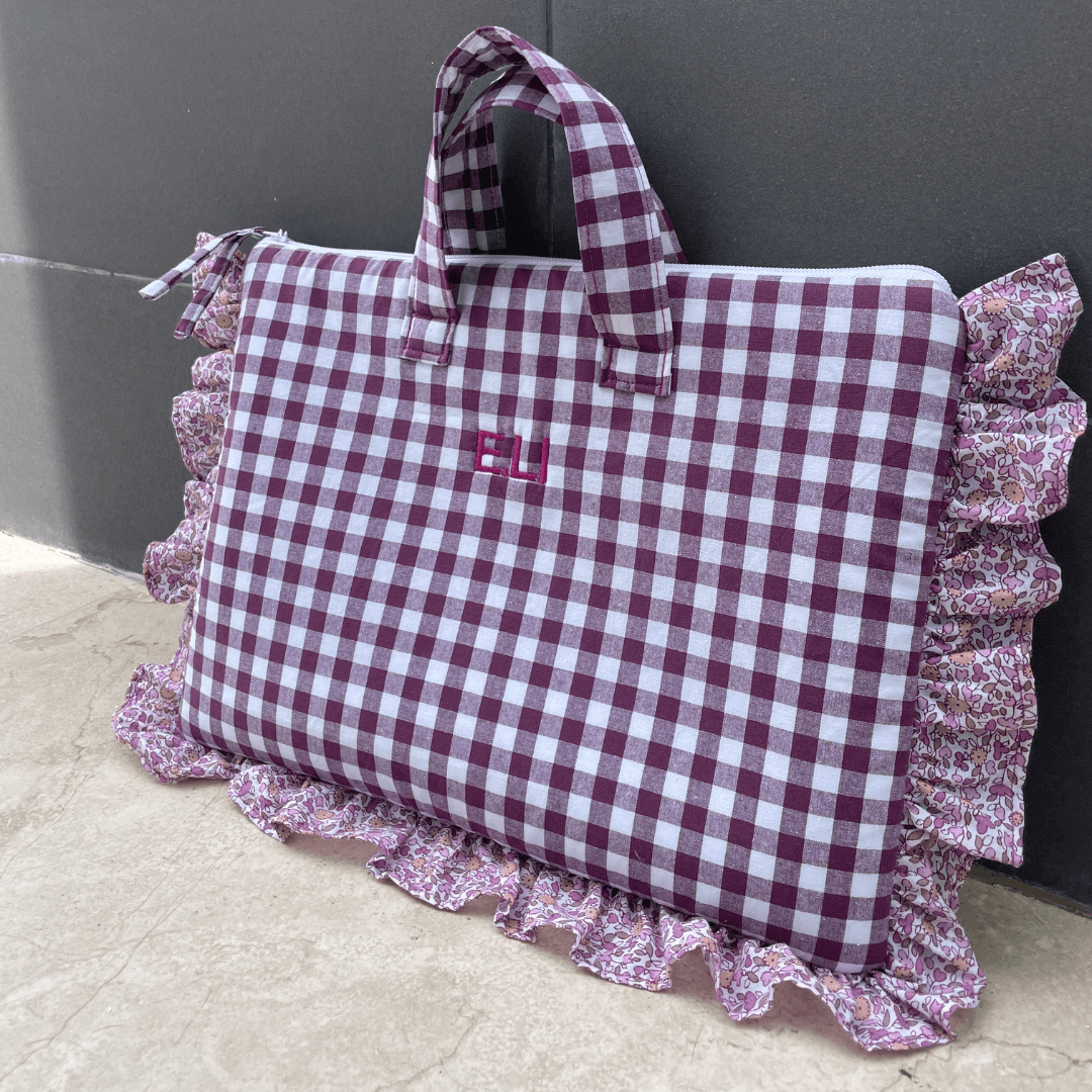 Está funda de ordenador la personalizamos desde cero, elegimos un diseño que ya teníamos y cambiamos los tejidos, añadimos las asas y las iniciales
