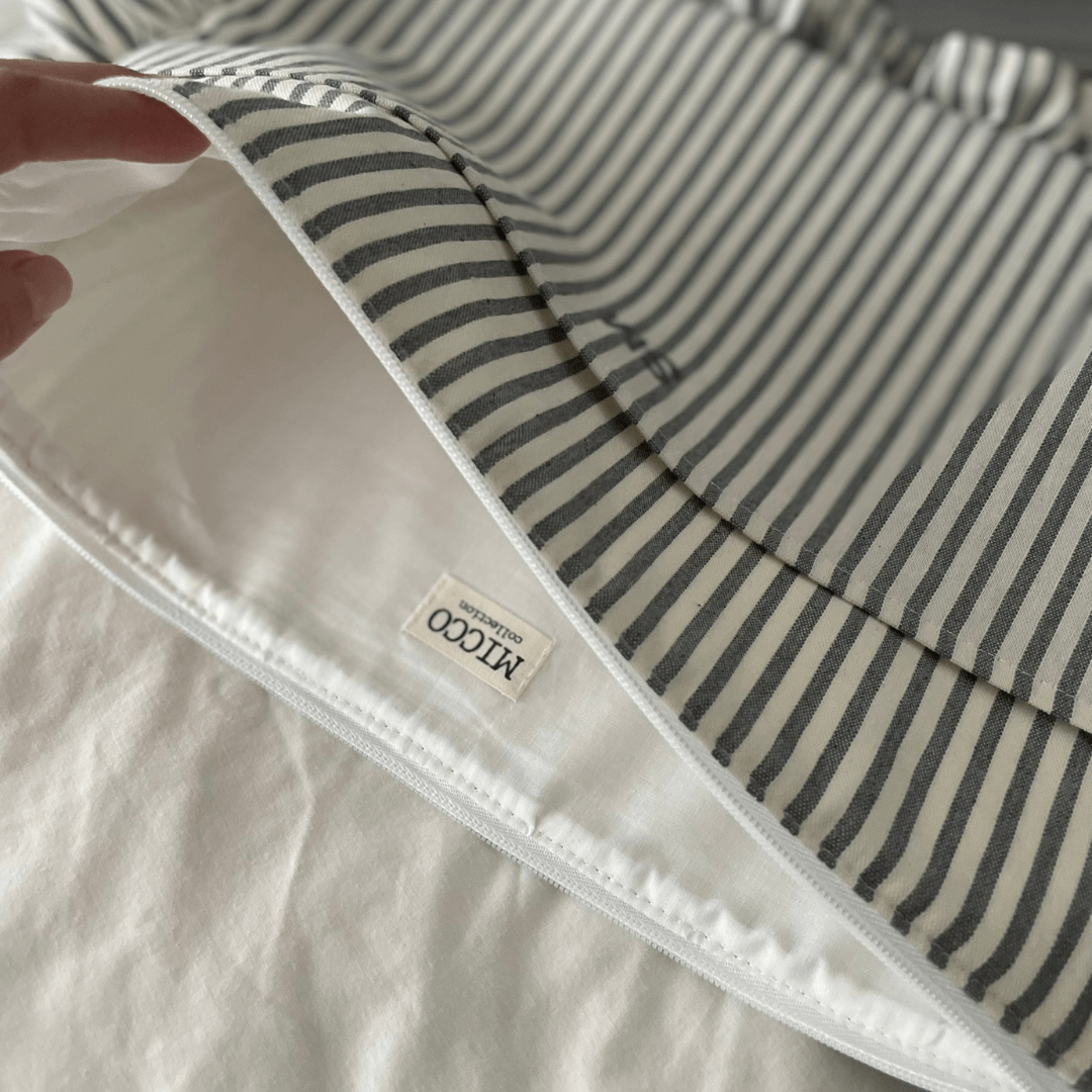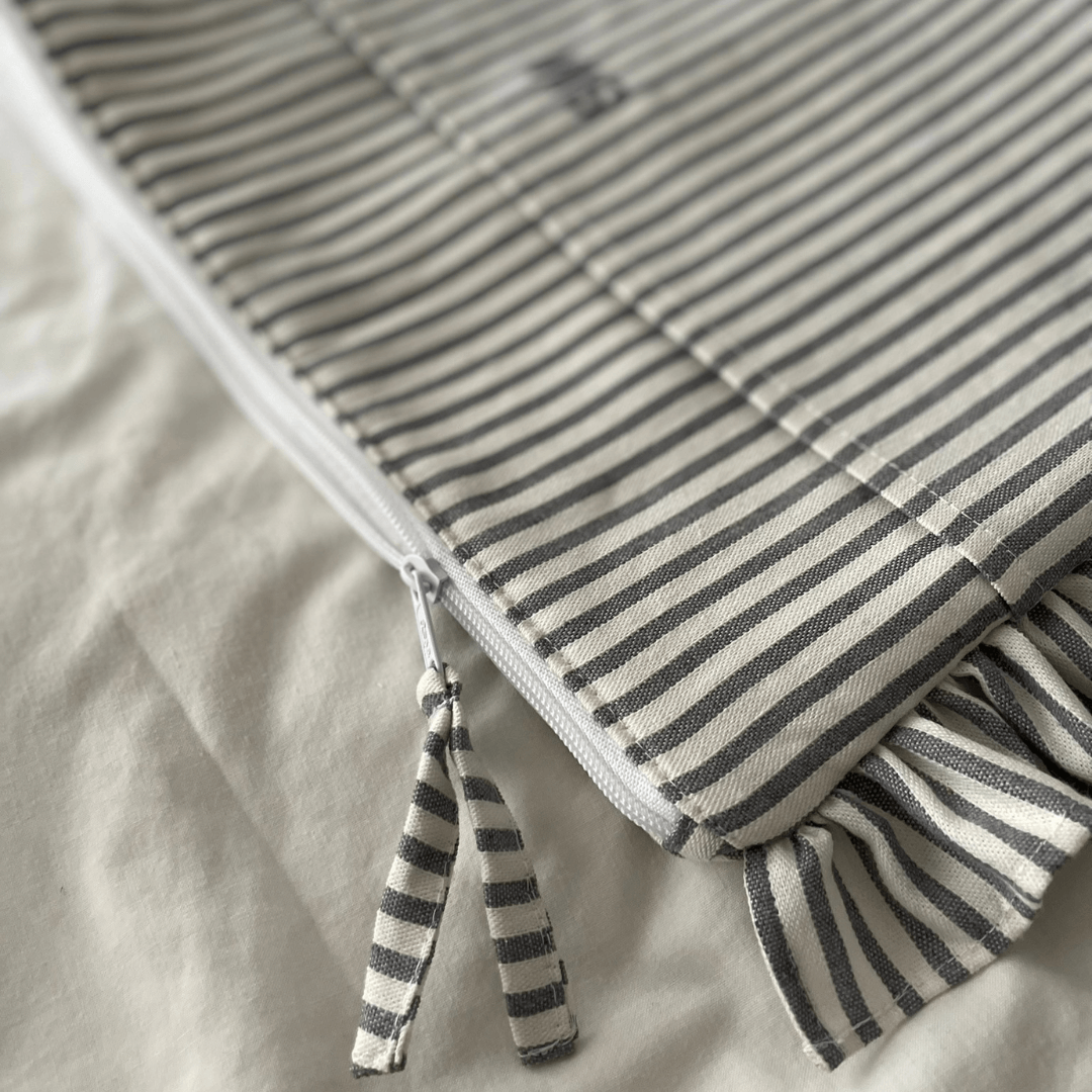 Funda personalizada de tejido de rayas en tono gris y crudo con un volante alrededor en el mismo tejido.