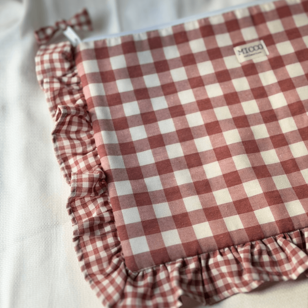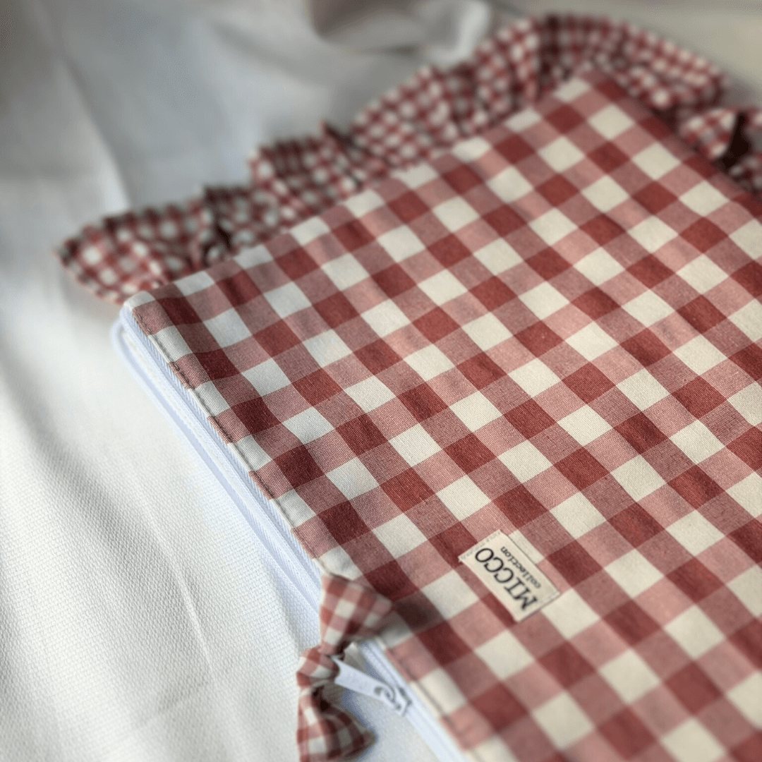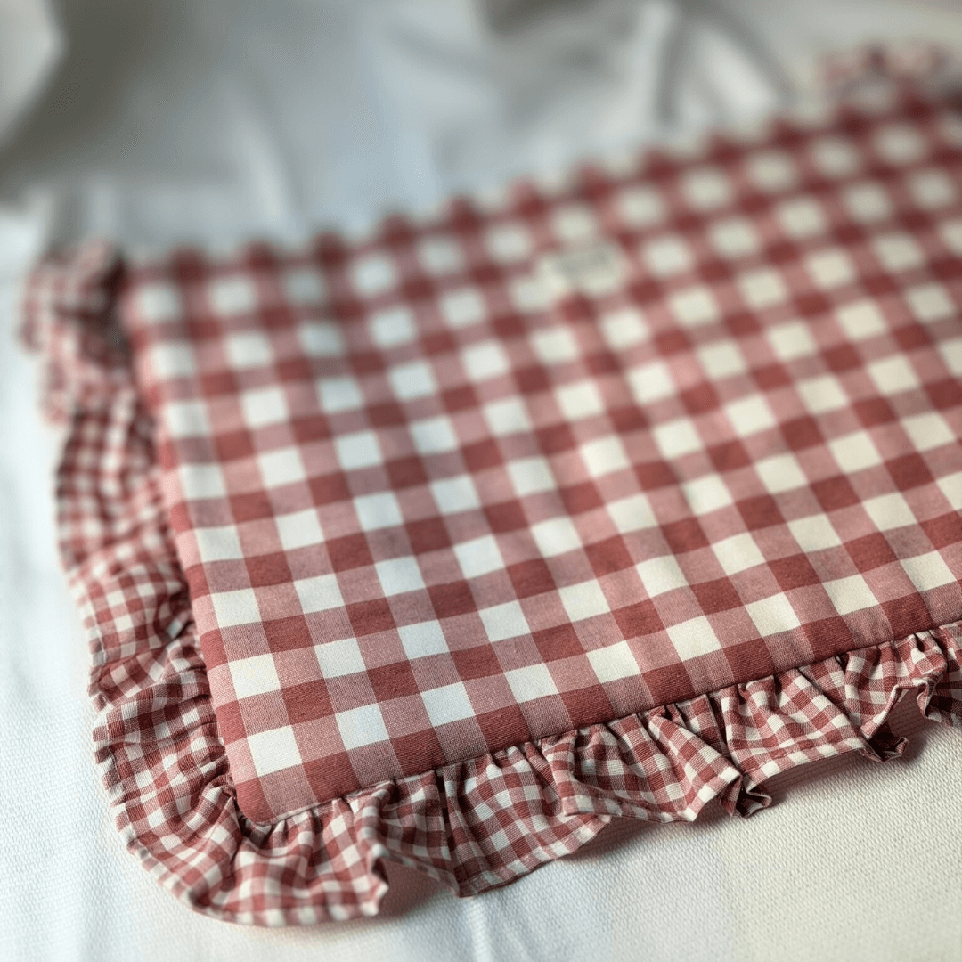 Funda personalizada combinada con cuadros de vichy rosa y cuadros mas grandes en el mismo color, con un volante alrededor en el mismo tejido.