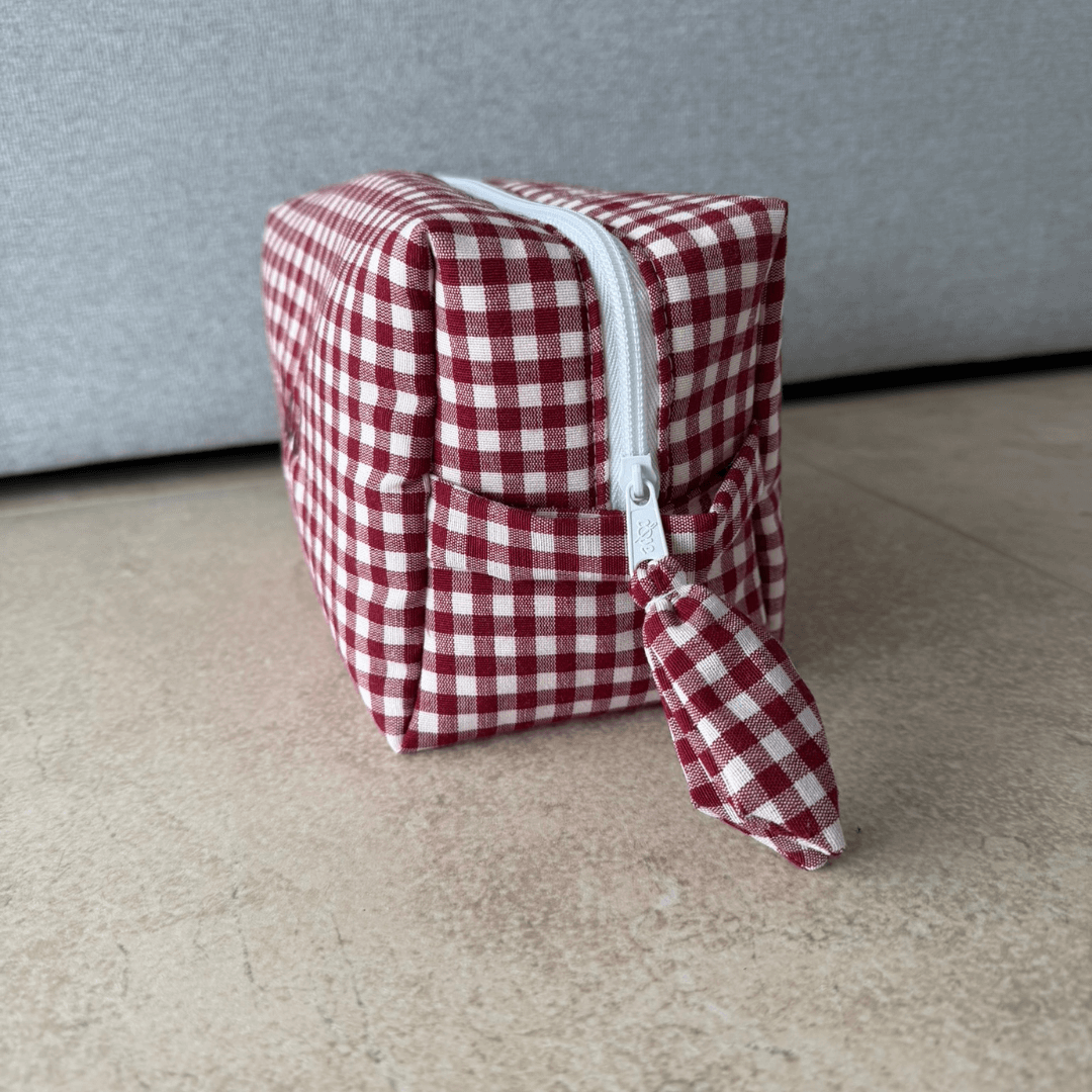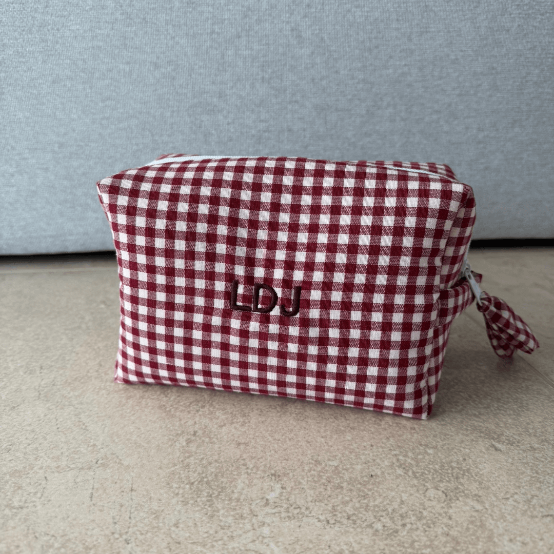 Neceser tamaño grande, en estampado de cuadros de vichy burdeos. Tirador en forma de lacito. Puedes personalizarlo con tus iniciales.